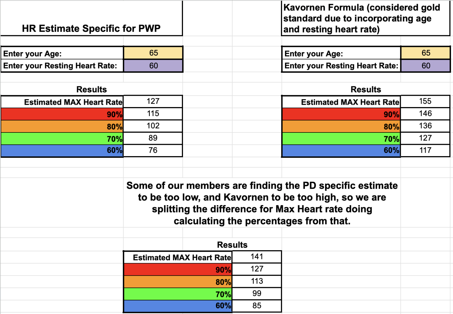 First step, determine your max heart rate with an exercise test, or estimate using a new research based formula specific for people with Parkinsons.