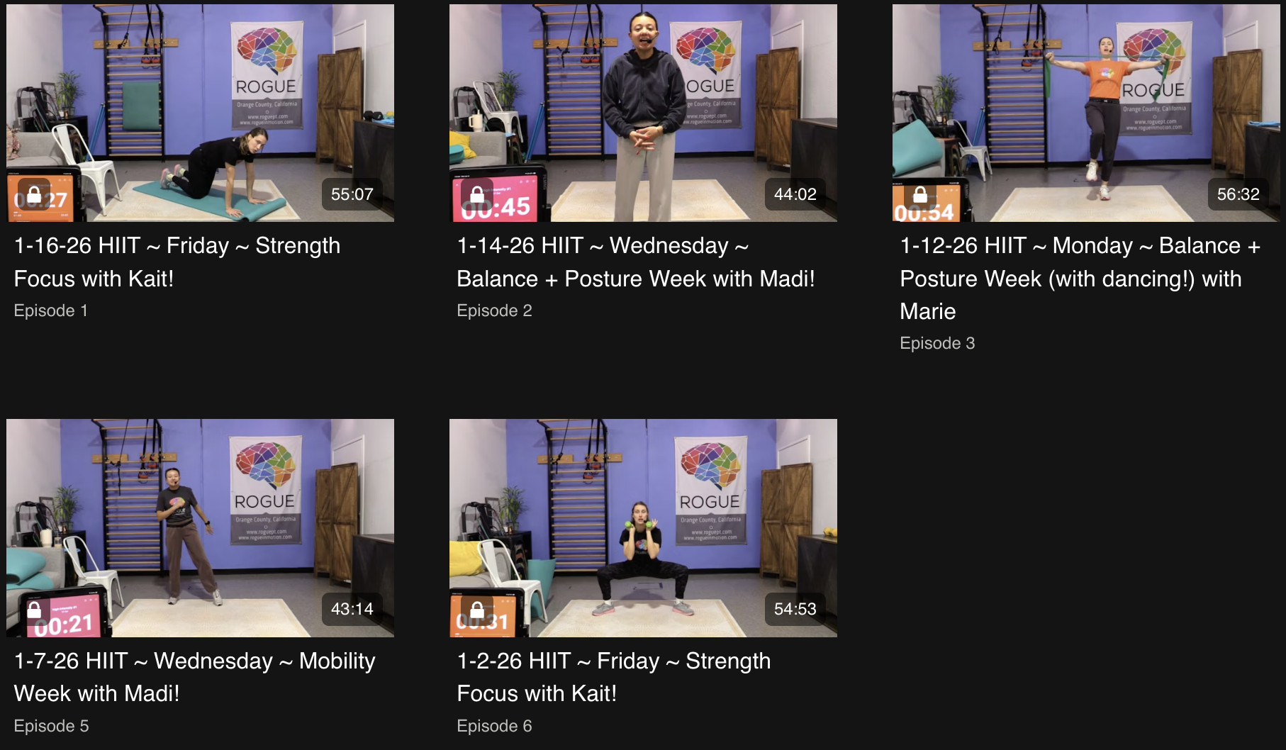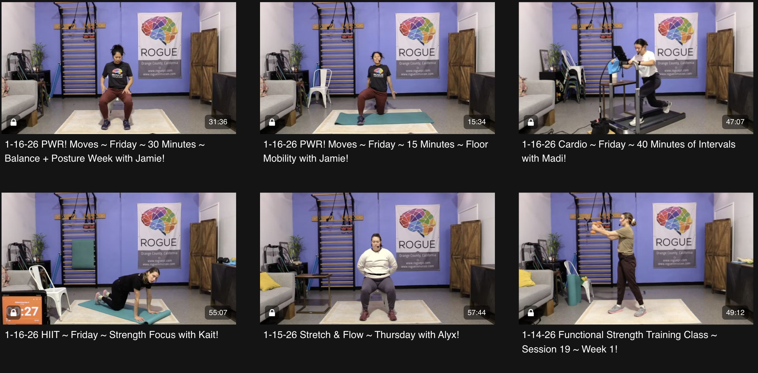 If you don’t live near Orange County or prefer not to commute, our Rogue in Motion online membership brings structured Parkinson’s exercise directly into your home. It combines physical therapy principles with a library of follow-along workouts, so you always know what to do each day.